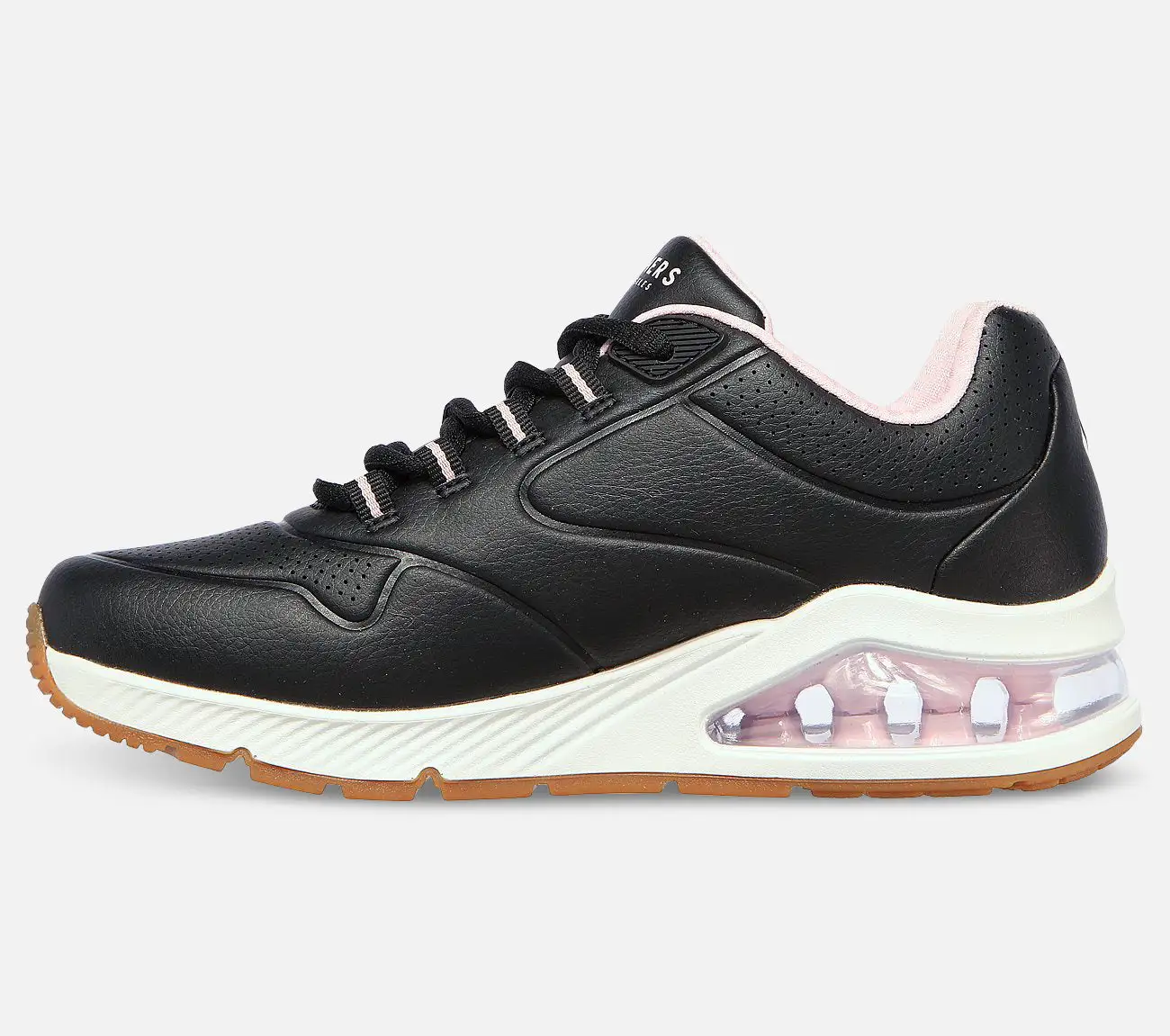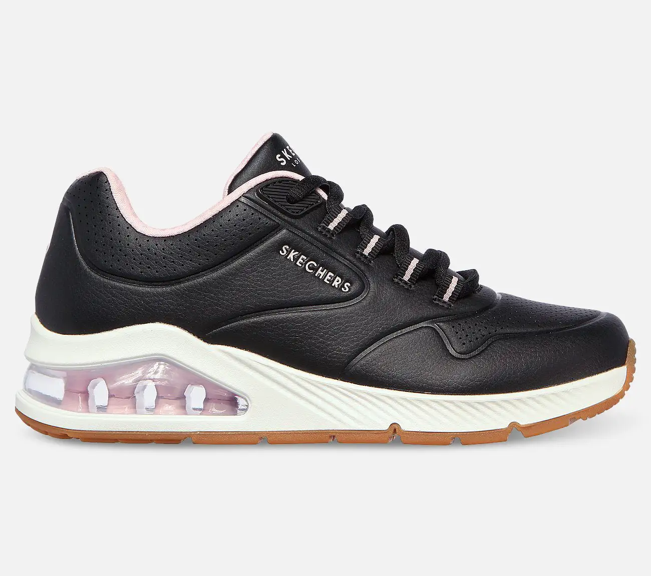 Tässä nauhallisessa kengässä on synteettinen nahkamainen päällysosa, ilmajäähdytteinen Memory Foam -sisäpohja ja alustakiila, jossa on näkyvä ilmapehmustettu Skech-Air -välipohja.
