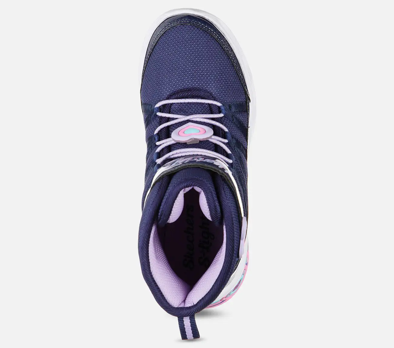 Skechers Sweetheart Ligths – Love To Shine -talvisaappaiden pohjassa on loistavia sydämiä. Sydämet syttyvät, kun saappailla kävellään. Valo sammutetaan kantapäässä olevan napin avulla. Saapas on helppo pukea jalkaan kuminauhan ja tarrakiinnityksen